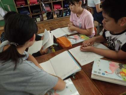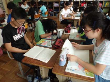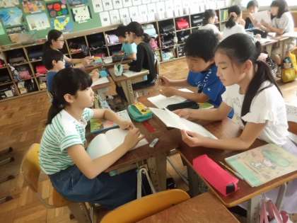 国語科「筆者の意図をとらえ,自分の考えを発表しよう」では,「時計の時間と心の時間」の説明的文章を読んでの自分の考えを友だちに発表しました。発表を聞いた人は自分の考えとくらべてどう思ったか,発表者に伝えることができました。