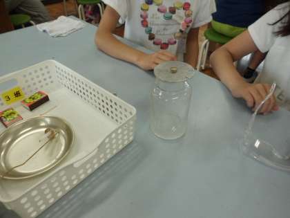 理科「ものの燃え方」では,石灰水を使って,燃える前と燃えた後との空気の違いを確かめました。びんを振ると石灰水が白く濁ることに,子どもたちはびっくりしていました。