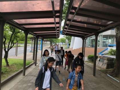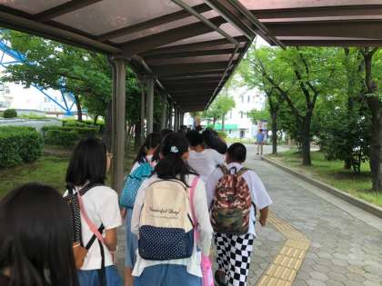 1つ目の目的地,名古屋港水族館に到着しました。これからクラスごとに写真を撮って水族館の中を見学します。