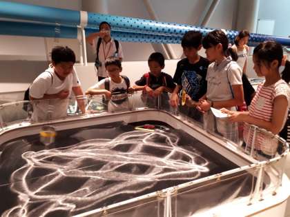 飛び出す雲のリング,耳を塞いでも額から振動が伝わる骨伝導の仕組み,振り子が描く砂の不思議な模様。不思議な体験をして、子どもたちは楽しんでいます。