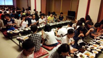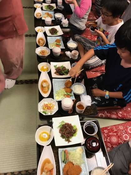 1日中,たくさん移動してたくさん体験した後は,待ちに待った夕食タイムです。品数の多さに食べ切れるか心配している子もいました。