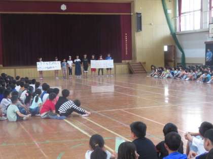 なかよし集会が体育館で行われました。代表委員会で各クラスの学級目標をもとに今年度の児童会目標を話し合いました。そして今年度の児童会目標は,「笑うから楽しい やさしいから助け合う」に決まりました。