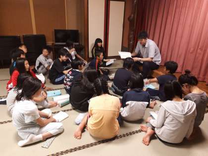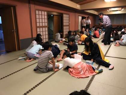 今日1日の活動を振り返ります。まずは係ごとに振り返り,それを受けて,班ごとに振り返りをします。リーダーとして,班で行動するときに気をつけたいこと,生活係から,宿での過ごし方や明日の時間に関すること,食事係から,明日のリトルワールドでの昼食時の注意,保健係から,明日を元気に過ごすために今日ゆっくり休むことなどそれぞれの班で伝え合いました。