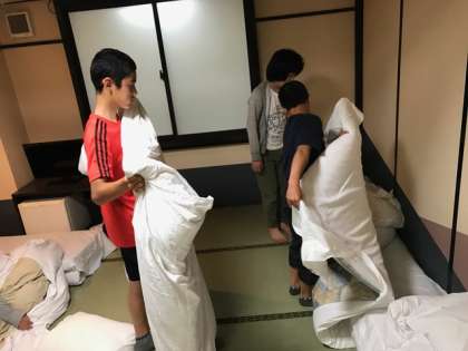 起床の時間です。各部屋で声を掛け合い,部屋の整理整頓をしています。よく寝れたので昨日の疲れも取れたようです。2日目の活動も頑張ります。