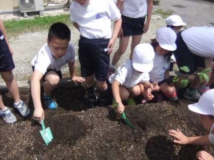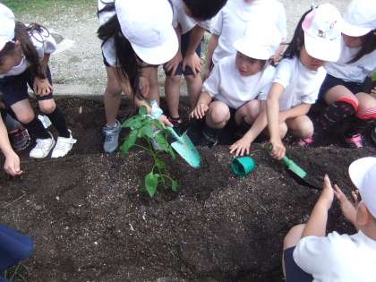 生活科で,夏野菜を育てることになりました。オクラ・ナス・エダマメ・キュウリ・ピーマンです。大きな学年の畑の雑草抜きをして,グループで植えました。これからお世話も頑張ります。