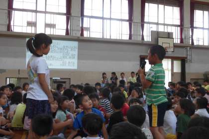 「山からみた京都の町のすばらしさ」「お互いに励ましあって登った山道」「おいしいお弁当」について,みんなにわかりやすく発表していました。発表を聞いた後,全校で感想の交流をしました。2年生もたくさんの子が手を挙げ,代表の児童が感想の発表をしました。