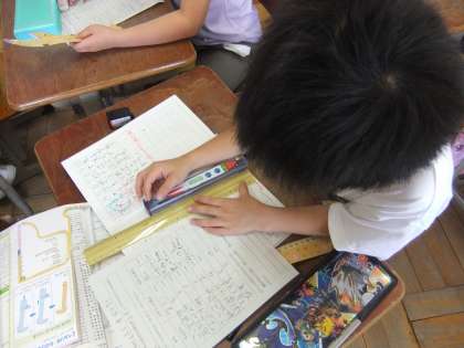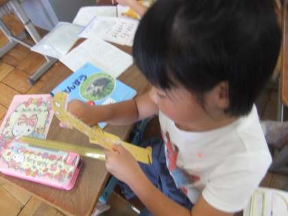 算数科の「長さ」で身の回りのものの長さを予想して,実際に30cmものさしで測る活動をしました。「ぴったり!」「思ったより長かった。」などいろんな声が聞こえてきました。右の写真は,恐竜ものさしでグーをした時の長さを調べています。