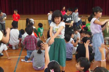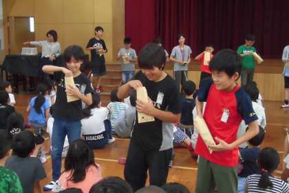 はじめは,少し照れながらジェスチャーしていた高学年でしたが,だんだんわかりやすく伝えるため,大きな身振りになっていきました。