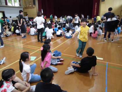最初はグループの5・6年生がジェスチャーをして問題を出していましたが,5・6年生に続いて4年生も積極的にジェスチャーして出題していました。そこからどんどんいろいろな学年が出題していってどのグループも盛り上がっていました。