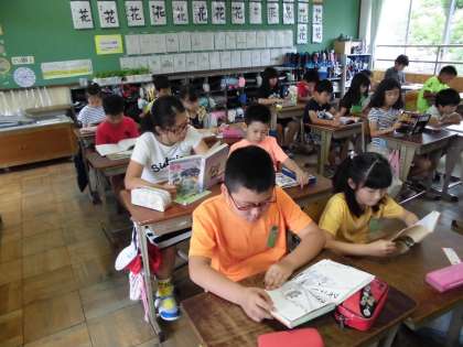 時間を忘れて読みふけっています。日直が「本を片付けましょう。」と言うと,どこか残念そうです。