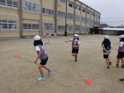 リレーの学習が始まってもう5時間目。バトンパスも上手になってきました。