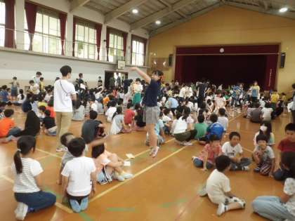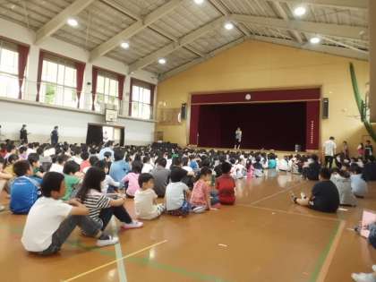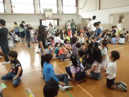 体育館に集まって,全校でたてわりあそびをしました。グループの5・6年生の1人があるジェスチャーをして,他の子が当てるというもの。どのグループもとても盛り上がっていました。