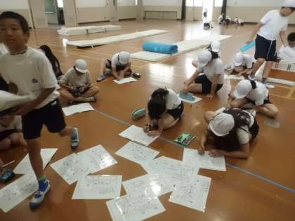 体育科ではマット運動に挑戦しています。終了後,カードにふり返りを書く子どもたち。気付いたことを次につなごうと努力しています。