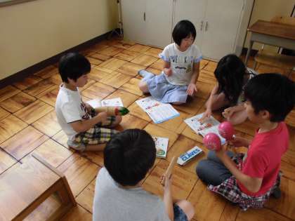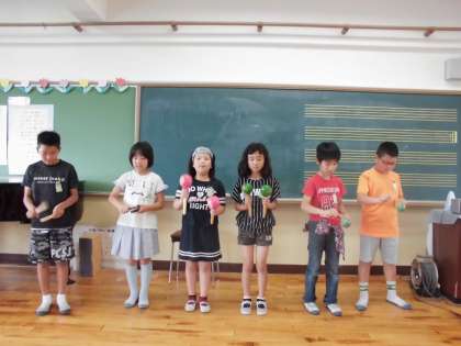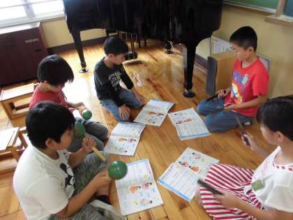 「いろんな木の実」の学習では,ギロ・マラカス・クラベスの3つの楽器を使ってリズム演奏しています。それぞれリズムが違うので,合わせてみるとつられて自分のリズムがズレてしまったり,間違えたりしてしまいます。でも,3つの楽器のリズムがぴったり合うと歌とマッチして素敵な演奏になります。違う楽器のリズムも聞きながら演奏できるといいなと思います。