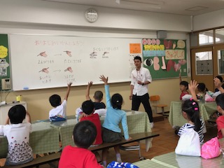 ランチルームでは栄養教諭による食に関する指導を行っています。今回,1年生は「おはしめいじんになろう」ということで,正しいお箸の持ち方の学習をしました。