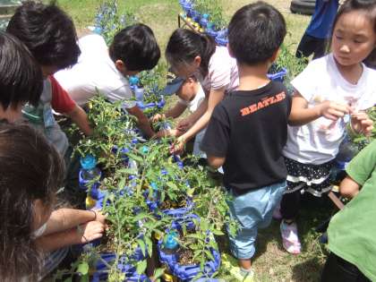 生活科で育てているミニトマトの観察へ行きました。葉が多くなり,黄色い星型の花をいっぱいつけていました。みんなは「大きく育ってね。」と,たっぷり水やりをしていました。