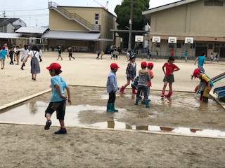 今日は,プールでの学習「みずあそび」の初日でしたが、あいにくの低気温と雨で延期になりました。午前中,運動場でも遊べませんでしたが,午後になると雨もやみ,運動場で遊べることになりました。子どもたちは長靴を履いて,喜々と運動場に出ていき,遊ぶことができました。おうちの方,チェックカードをはじめ,プールの学習の用意をありがとうございます。今後ともどうぞよろしくおねがいいたします。