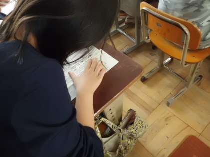 書写では,京都市の書写展に向けて,「枕草子」の一節の清書に挑戦。練習で身につけた「行の中心と余白のとり方」に気を付けて,サインペンで字配りよく書いていきました。
