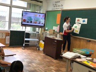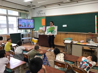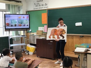 モンタナ先生が教室で,英語の絵本を読んでくれました。読み聞かせは子どもたちが大好きなもので,一生懸命聞いていましたが,それは日本語の読み聞かせも,英語の読み聞かせも同様に好きなのかもしれません。今日は「BROWN BEAR」というお話でした。きれいな色の絵本で,子どもたちは色を表す英語が出てくるたびに嬉しそうに発音していました。絵本の後は,色を使った楽しいゲームをして盛り上がりました。
