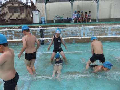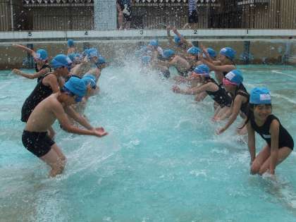 チームごとに水かけ合戦をしました。どちらがたくさんかけられるか競争しました。2人でじゃんけんをして,水の中をまたくぐりをして水遊びを楽しむことができました。
