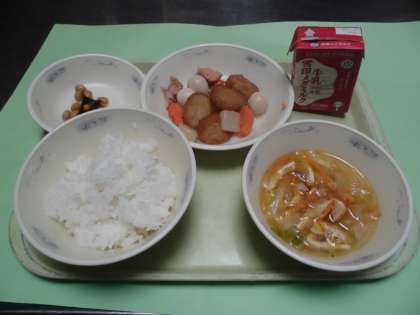 平天とこんにゃくの煮つけは具だくさんで,みんな喜んで食べていました。こんぶ豆は少し甘辛い味付けで,ごはんがすすんでいました。