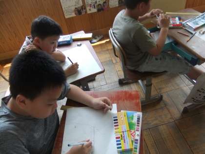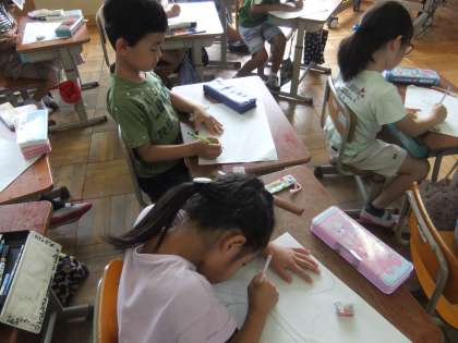 図画工作科で,「計量の図画」の下描きをしました。2年生の学習で使用した30cm物差しを持って,自分の測りたいものを測っている様子です。子ども達は,ものさしの持つ手がどうなっているか,実際に手で持ちながら描いていました。