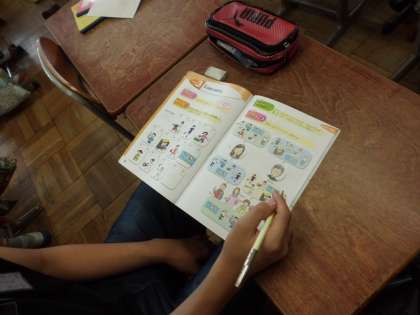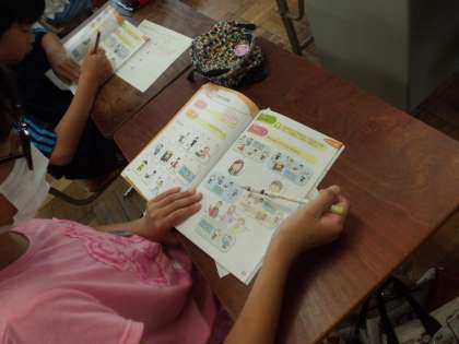 外国語科「I can swim.」では,音声を聞いて,登場人物ができることとできないことを聞き取り,絵を○と△で囲みました。流暢な英語のため,何度も聞き返す中で,正しく聞きとることができるようになりました。