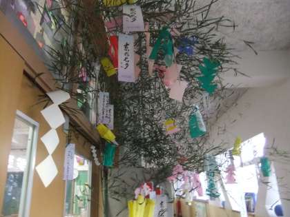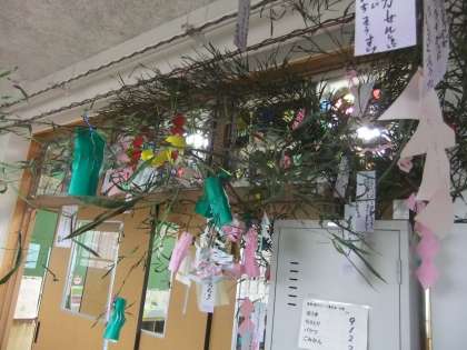 立派な竹笹が届き,みんなで作った願い事の短冊や飾りなどを付けました。