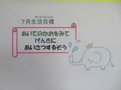 7月の生活目標は,「あいてのかおをみてげんきにあいさつするぞう」です。吉祥院小学校の挨拶の輪がどんどん広がっています。