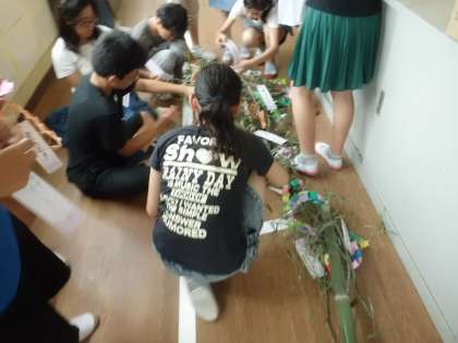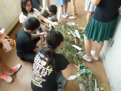 七夕の笹に短冊と飾りをつける子どもたち。願いが叶うといいですね。