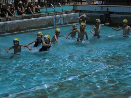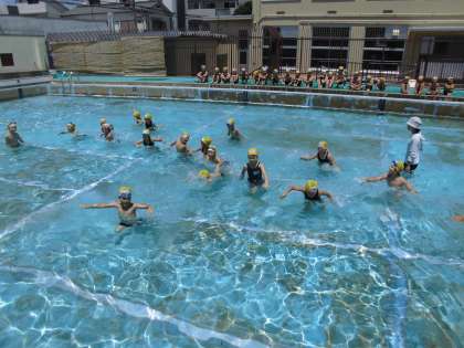 今日は気温がぐんぐん上がり,晴れ渡った空の下,みずあそびの学習をしました。初めはみんなで水の中をかけっこしたり,バタ足をしたりしました。その後,バディ(二人組)になって自分たちでめあてを決めて,学習しました。バディで水中じゃんけんをしたり,鼻や口から泡を出す「プクプクかにさん」になったりしました。これからも水の中の安全に留意しながら,バディでしっかりめあてをもち,学習を進めていく予定です。