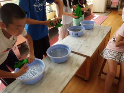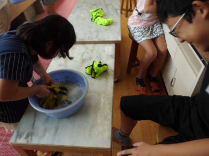 家庭科の学習で洗濯の仕方について学びました。桶に水をくんで,ビブスを洗う子どもたち。とてもきれいになりました。