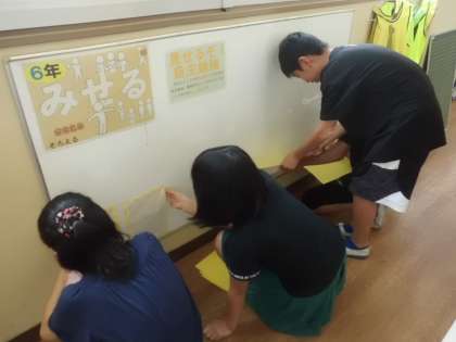 廊下の掲示板に貼ってある掲示物をきれいにはがす子どもたち。頑張り屋さんです!