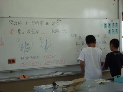理科「植物の成長と水の関わり」では,葉の表面から水が出ていると考えた子どもたち。では葉の表面は一体どうなっているのか。顕微鏡で見ていくことにしました。