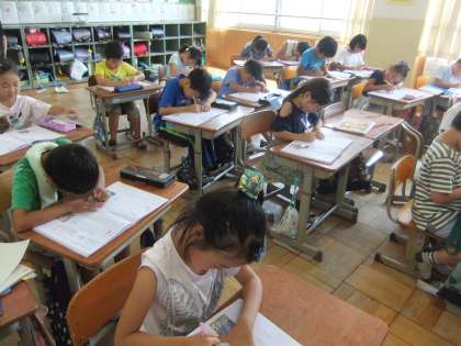 毎日暑い日が続きますが,教室で集中して学習に取り組んでいます。写真は新出漢字に取り組んでいます。姿勢よく指なぞりをして,筆順を確かめながら丁寧に書いています。