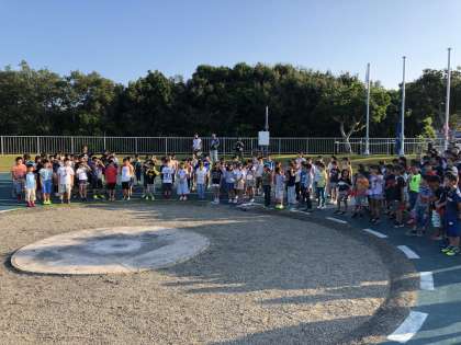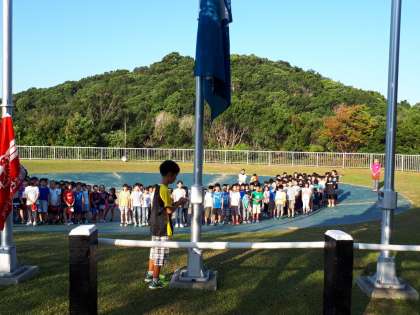 七条第三小学校と一緒に朝の集いをしました。校旗を揚げながら校歌を歌い,学校紹介もとても上手にできました。空は,雲一つない晴天。水分補給をしっかりしながら,今日も充実した1日にしたいです。