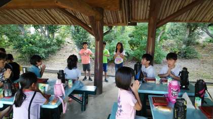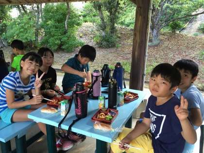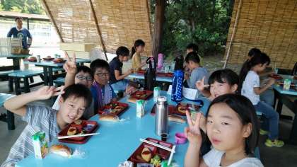 朝食は東屋で食べます。さすが2日目にもなると,生活係もテキパキと配膳できるようになりました。熱を出した子どももなく,みんな笑顔です。