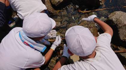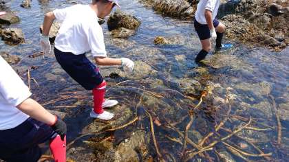 大きな岩に気を付けながら歩き,ようやく宮崎浜に到着しました。早速,生き物を見つけて,子どもたちは盛り上がっています。