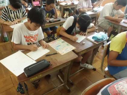 夏休みの宿題で取り組んだ自由課題の作品カードを書く子どもたち。自分の作品を一生懸命にアピールしています。