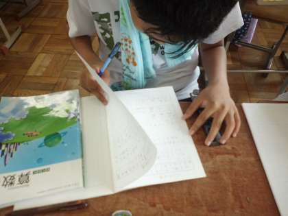 算数科「比とその利用」では,全体の量と比から,2つの数を求める方法を考えました。ノートを見返しながら考えることで,考えをまとめるヒントになったようです。