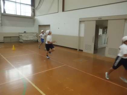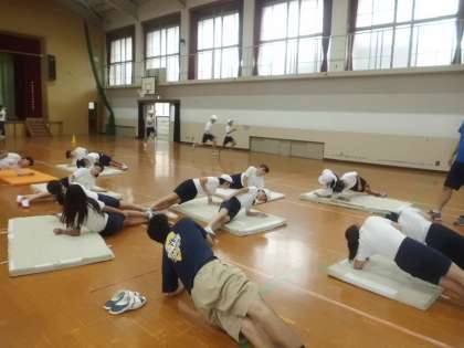 雨の日も朝チャレに精を出す子どもたち。体幹トレーニングで姿勢を維持できる時間も伸びてきました。