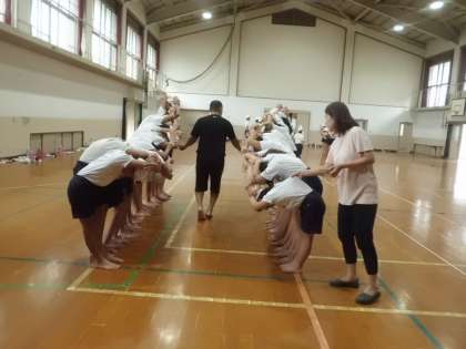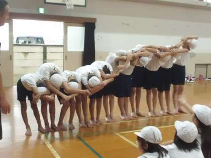 組体操ではウェーブに挑戦。1〜8のカウントを自分でとって起こしたり下げたりする演技。みんなの動きがきれいにそろうまでには,もう少し時間がかかりそうです。