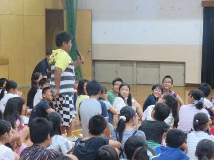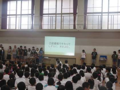 朝会で委員会の発表がありました。一つ目は図書委員会で,図書館の使い方の発表でした。二つ目は運動安全委員会で,廊下や階段の歩き方の発表でした。劇を見てどのように歩けばいいのか考えました。