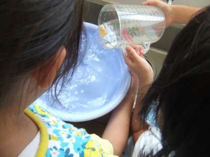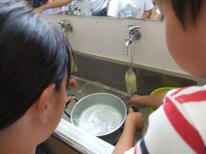 算数の「かさ」の学習で,身近なもののかさはどれぐらいか予想して調べてみました。やかん,両手鍋,お玉,大洗面器,スプーンなど…。スプーンは小さくて,mLますで何杯か調べるのに苦労していました。やかんと両手鍋は6Lで同じかさでした。見た目と違ったり,予想に近かったりして,楽しく活動することができました。