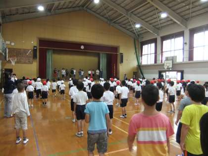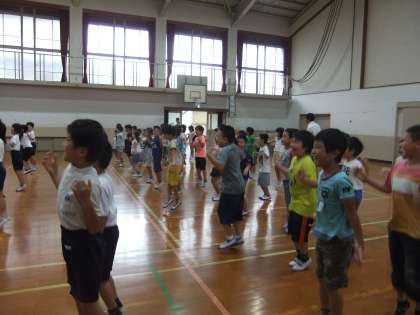 中間休みに,体育館で全校ダンスの練習をしました。高学年のダンス係のお手本を見ながら,「ウホウホ」や「ハイハイハイハイ!」と元気よくかけ声を詩ながらノリノリで踊りました。