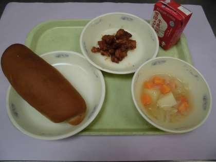 チキンのアングレスは,今年度はじめてでたので,一年生は,はじめて食べました。「アングレス」は,イギリスのという意味があり,イギリス発祥のウスターソースで作ったタレをからめて作りました。少し濃い味付けで,あっさりとしている野菜のスープ煮ととても合っていました。一年生も,おいしいと感じてくれたようで「また食べたい」という声をきかせてくれました。
