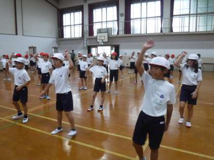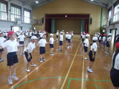 ソーラン節の練習の様子。個々の動きに加えて,隊形移動の練習も入ってきました。難易度も上がってきますが,子どもたちは元気よく,そして真剣に取り組んでいます。