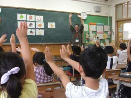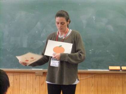 2回目のモンタナ先生と英語の学習をしました。フルーツについて,ペアとキーワードゲーム。写真は手を挙げてキーワードを見つけて対戦しているところです。後半は,みんなでフルーツバスケットをしました。