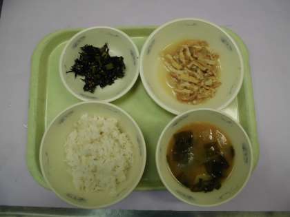 小松菜とひじきのいためものは,ごま油の香りがしっかりとしていて,おいしかったです。また,小松菜はしっかり噛まないと飲み込みにくいので,しっかりと噛んで食べれていました。
