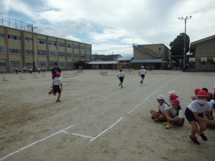 運動会の100m走の練習をしました。スタート位置には駆け足で入る子どもたち。全員がそろってできている姿は,とてもかっこいいです!